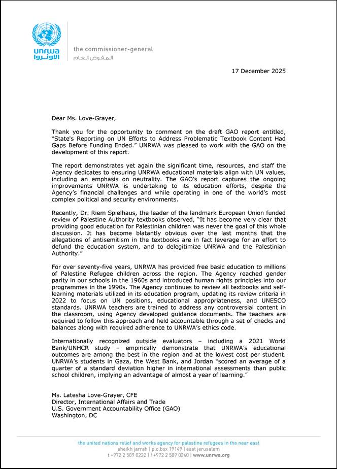 In March 2025, State severed all financial ties with UNRWA, which it formalized in a letter to UNRWA’s Commissioner General. [39] In June 2025, State also ceased its participation in UNRWA bodies, including the Advisory Commission and its Sub-Committee. Therefore, we are not making any recommendations for State to improve its congressional reporting.
