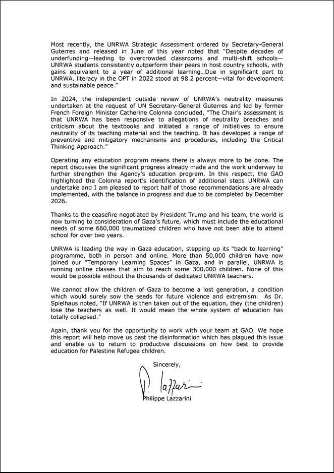 [39]The letter severed financial ties between State and UNRWA and asked for the return of any unspent funds.