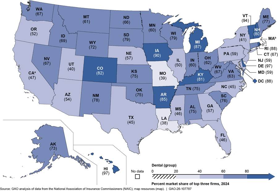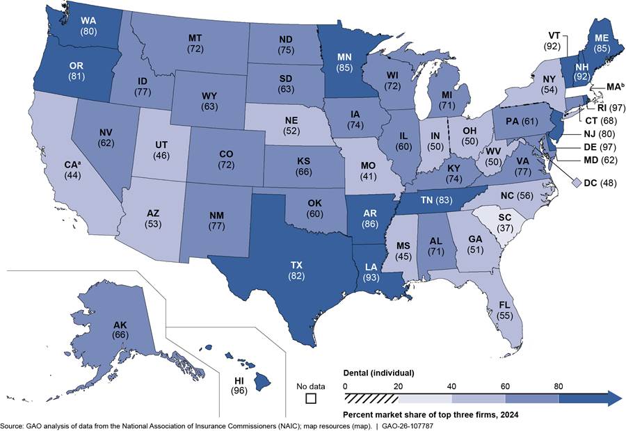 Concentration. According to our analysis of 2024 data from NAIC, the concentration of private group and individual stand-alone dental insurance markets varied among states. Across all states, the combined market share of the three largest dental insurers in each state ranged from about 38 to about 98 percent of enrollment for the group market and about 38 to about 98 percent for the individual market. Market share of the single largest dental insurer in each state ranged from about 14 to about 95 percent for the group market and about 14 to about 95 percent for the individual market. See table 1.