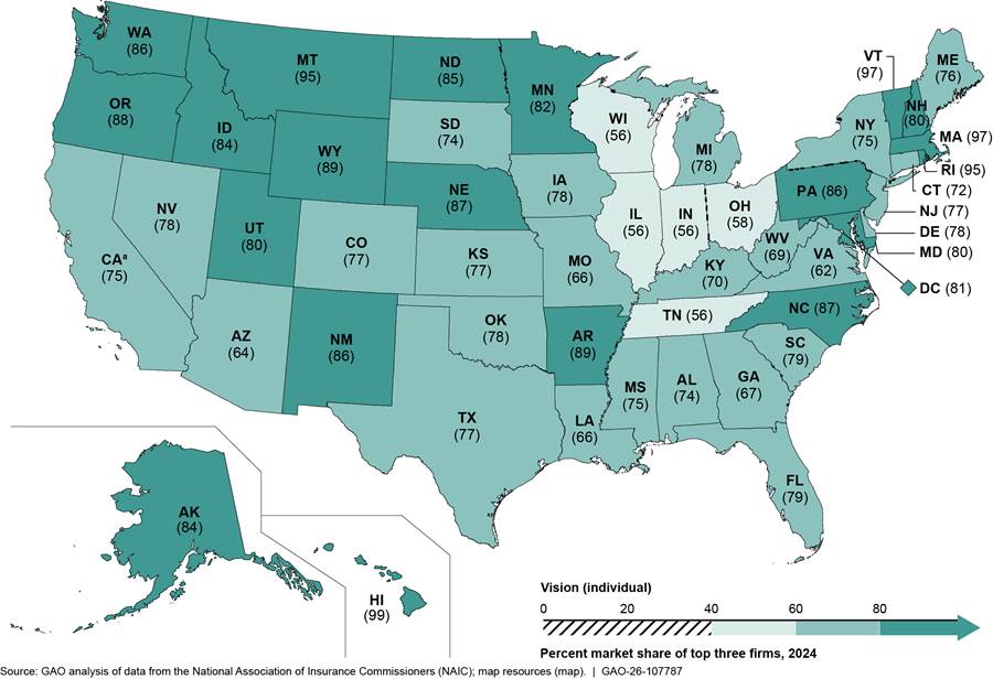 Note: Consumers can either purchase dental or vision coverage as part of a group plan, such as one offered through an employer, or individually, such as through a health insurance exchange. These exchanges, required to be established in each state by the Patient Protection and Affordable Care Act and operated by either the state or federal government, are marketplaces where eligible individuals and small employers can choose insurance plans offered by participating insurers. We calculated market share for each state based on the total number of individuals insured as of December 31, 2024, as reported by insurers to NAIC. Because there can be multiple insurers within a market that share a single parent company, we aggregated such insurers to the parent-company level following the aggregation scheme set forth by NAIC. We excluded all data from Massachusetts from our dental insurance market analysis due to a potential reporting error that we identified in one dental insurer’s enrollment data. We also excluded insurers that reported zero in enrollment in a state market. NAIC data do not include about five million enrollees in private, stand-alone dental plans in California from insurers that are regulated by the California Department of Managed Health Care.