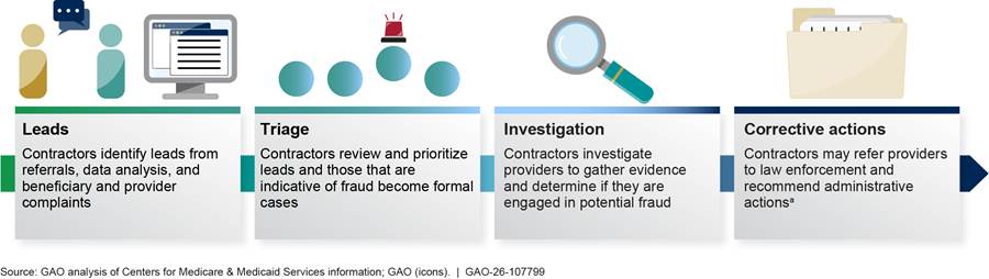 [51]CMS tracks cases as linked to FPS if FPS information is an input to developing the lead for the case, even when FPS information may not materially contribute to investigative activities or ensuing actions. According to officials, CMS does not track the “primary source” of leads that initiate fraud cases because many leads derive from multiple sources.