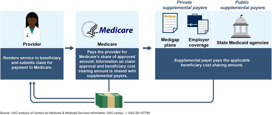 In December 2025, CMS began sharing information about Medicare provider payment suspensions with supplemental payers—private plans and state Medicaid agencies that cover certain Medicare beneficiaries’ out-of-pocket expenses. CMS did not share such information previously. This lack of information sharing led some supplemental payers to pay beneficiary cost sharing on potentially fraudulent claims. Representatives of private payers estimated that private plans may have paid tens of millions of dollars in beneficiary cost-sharing for the urinary catheter scheme. GAO’s analysis found that state Medicaid agencies paid at least $196,000 in state and federal funds for cost-sharing payments for the urinary catheter scheme in 2023 and 2024.