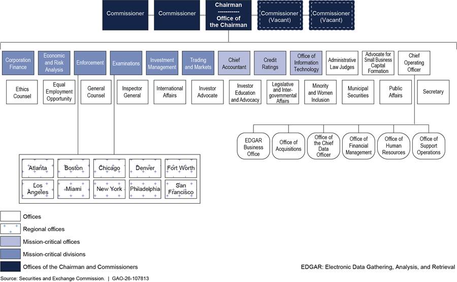 SEC is led by a commission that oversees its operations and provides final approval over staff interpretation of federal securities laws, proposals for new or amended rules to govern securities markets, and enforcement activities.[7] Headed by the SEC Chairman, the commission oversees six divisions, 25 offices, and 10 regional offices (see. fig. 1).[8] SEC has designated all six of its divisions and three of its offices as mission critical (i.e., primarily responsible for implementing SEC’s mission). In 2025, SEC integrated the functions of its Strategic Hub for Innovation and Financial Technology—previously reporting to the Office of the Chairman—into other parts of the agency.