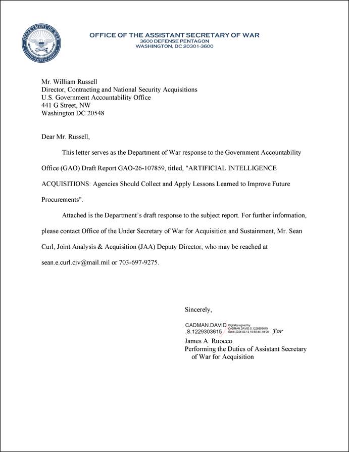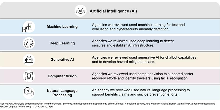 [5]GAO, Artificial Intelligence: Status of Developing and Acquiring Capabilities for Weapon Systems, GAO‑22‑104765 (Washington, D.C.: Feb.17, 2022); and Artificial Intelligence: An Accountability Framework for Federal Agencies and Other Entities, GAO‑21‑519SP (Washington, D.C.: June 30, 2021).