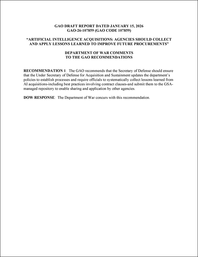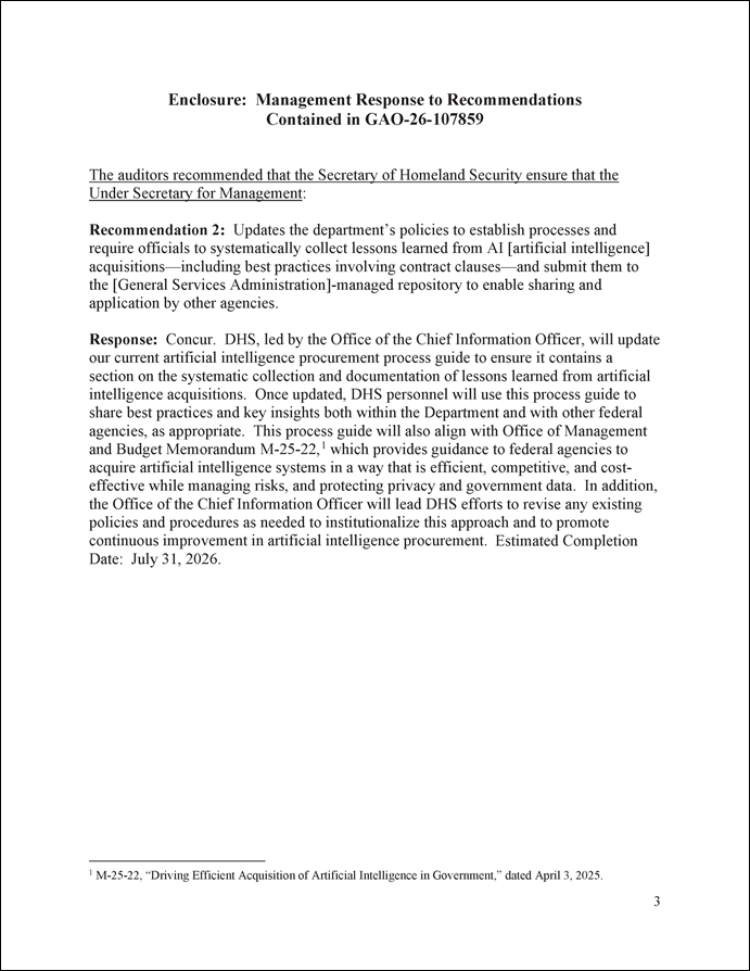 [2]Office of Management and Budget, Driving Efficient Acquisition of Artificial Intelligence in Government, OMB Memorandum M-25-22 (Washington, D.C.: Apr. 3, 2025).