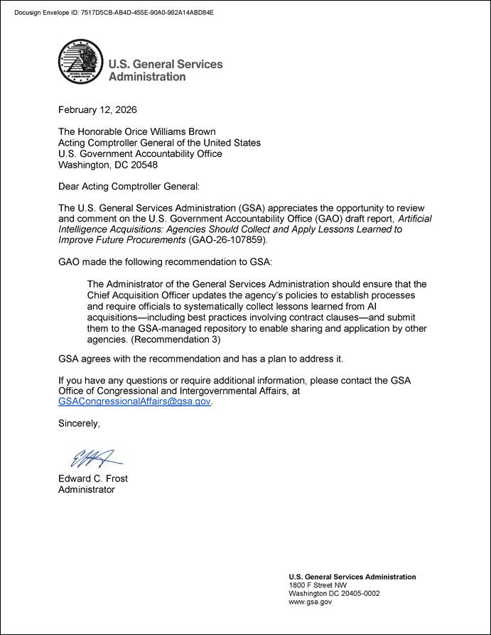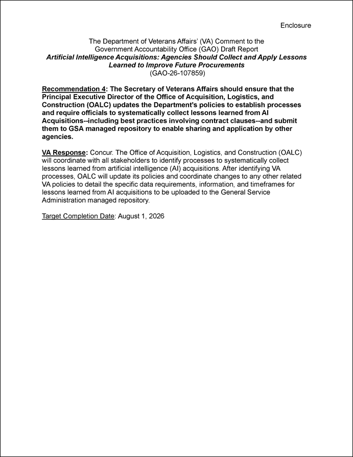 GAO is making a total of four recommendations. Specifically, GAO is recommending that DOD, DHS, GSA, and VA update their policies to require officials to systematically collect lessons learned from AI acquisitions to enable sharing and application by other agencies. The agencies concurred with all of the recommendations.