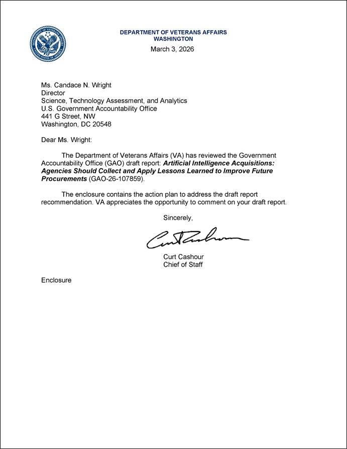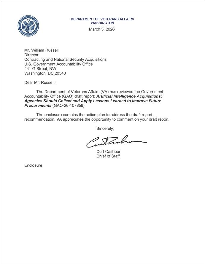 In April 2025, the Office of Management and Budget (OMB) issued guidance to help agencies acquire AI responsibly. OMB directed agencies to update their AI policies to comply with OMB’s requirements. GAO previously reported that agency-level implementation is critical to achieving acquisition goals directed by OMB (GAO-25-107398).