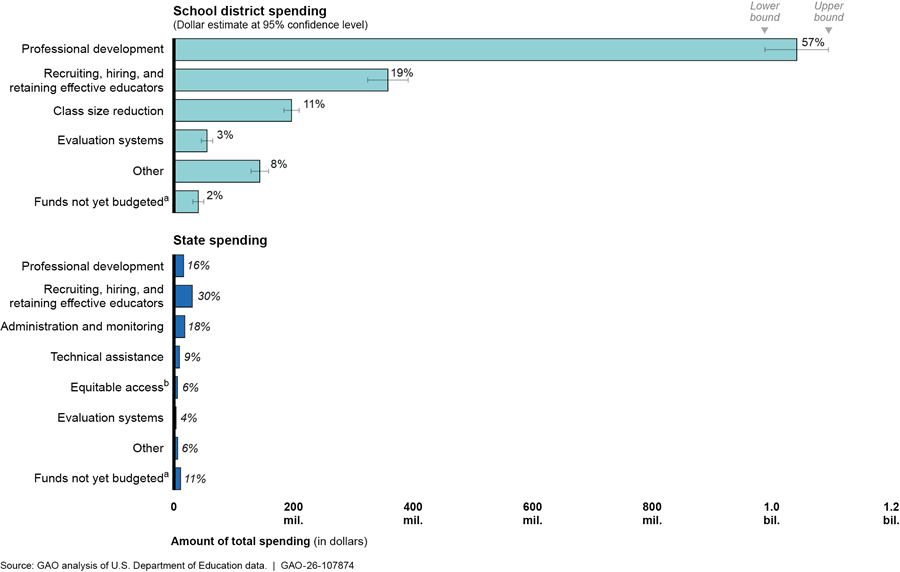[10]For school year 2023–24, the total amount available for Title II-A state-level activities was about $102.6 million, and for districts the total amount allocated was about $2.1 billion. Some allocated funds may not have been spent within the reporting period asked about in the survey, according to Education officials. States and school districts may have also made adjustments and transfers between programs that are not reflected in the spending subtotals. U.S. Department of Education, State and District Use of Title II, Part A Funds in 2023–24.