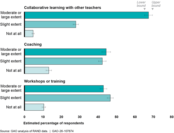 Notes: The brackets represent 95 percent confidence intervals; all nonoverlapping intervals are statistically different. According to RAND, results are nationally representative of teachers but may not represent new schools, new teachers, or experienced teachers new to a school district. RAND defines “collaborative learning with other teachers” as opportunities for teachers to work with teams of other teachers grouped by content area or grade level to address shared problems of practice; “coaching” as opportunities teachers have to be observed by experts and provided feedback; and “workshops or trainings” as learning experiences, typically offered by third-party providers outside the classroom, to teach educators about specific resources, materials, or instructional strategies. According to RAND, respondents were not provided with comprehensive definitions for each element of professional development and may have interpreted the terms inconsistently.