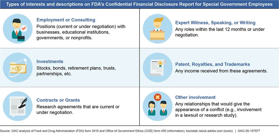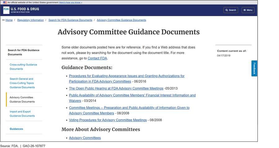 Food and Drug Administration (FDA) Advisory Committee Conflict of Interest Guidance FDA has some final and draft guidance documents for staff, the public, and advisory committee members related to different aspects of conflict of interest: · Procedures for Evaluating Appearance Issues and Granting Authorizations for Participation in FDA Advisory Committees (draft June 2016), which describes FDA’s process for: · Evaluating a committee member’s financial interests and relationships for potential appearance issues, and · Granting an appearance authorization. · Public Availability of Advisory Committee Members’ Financial Interest Information and Waivers (final March 2014), which describes FDA’s process for: · Publicly disclosing financial interests and waivers for committee members. · The Open Public Hearing at FDA Advisory Committee Meetings (final May 2013), which describes FDA’s process for: · Public participation in advisory committee meetings, and · Encouraging public speakers to disclose relevant financial relationships. Source: GAO analysis of FDA documentation. | GAO‑26‑107877 |