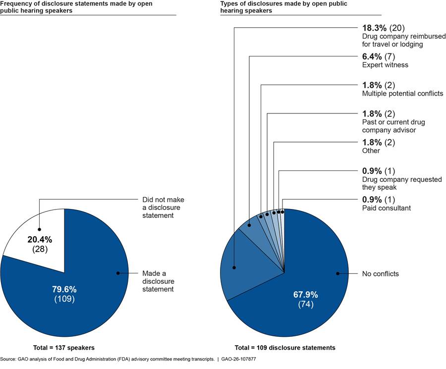 FDA held 17 meetings for AADPAC and DSaRM, the two committees that review opioids, between June 2018 and May 2025. Among other things, the meetings considered public health risks related to the misuse or accidental exposure to opioids, as well as data on the safety and effectiveness of these drugs.[33] FDA’s conflict of interest review process for these meetings resulted in recusals, a financial waiver, appearance authorizations, and public disclosures of financial interests or conflicts. These results applied to FDA’s review process for advisory committee members and guest speakers who participated in these committee meetings. We also reviewed disclosures made by open public hearing speakers present at these meetings.[34]