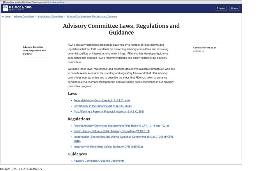 [13]FDA’s website lists the federal laws and regulations that set the standards for convening advisory committees and any guidance FDA has developed describing the agency’s policies on advisory committees.