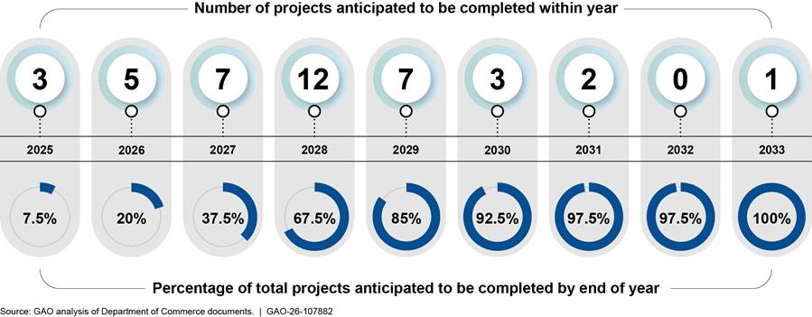 Each project includes unique milestones, which span from November 2024 through October 2033. Commerce officials stated that companies have submitted milestone completion reports for 24 of 161 milestones, as of July 2025. One project, a new leading-edge logic chip manufacturing facility in Arizona, was certified as complete in June 2025.