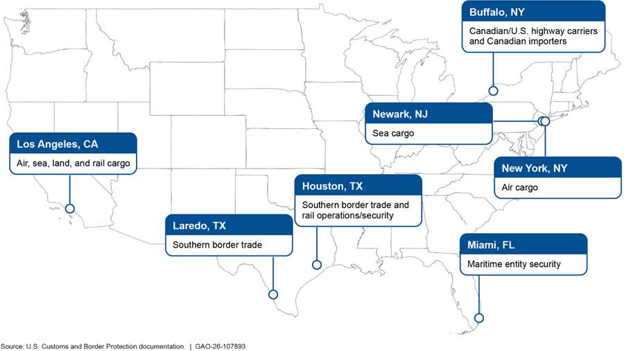 As of July 2025, CBP employed 157 personnel across the CTPAT program’s headquarters and seven field office locations.[12] Specifically, these CTPAT personnel operate from the program’s headquarters in Washington, D.C., and seven field offices located in the United States: Los Angeles, California; Miami, Florida; Newark, New Jersey; Buffalo and New York, New York; Houston, Texas; and Laredo, Texas. Each field office has a specific trade focus. For example, the Laredo, Texas field office focuses on southern border trade while the Newark, New Jersey field office focuses on sea containers. See figure 3 for more information on each field office’s trade focus.