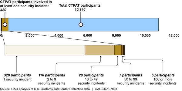[27]The number of CTPAT participants involved in security incidents includes incidents identified by CTPAT program personnel located at the headquarters office. These data do not include on CTPAT participants involved in security incidents reported from program field offices or self-reported from CTPAT participants.