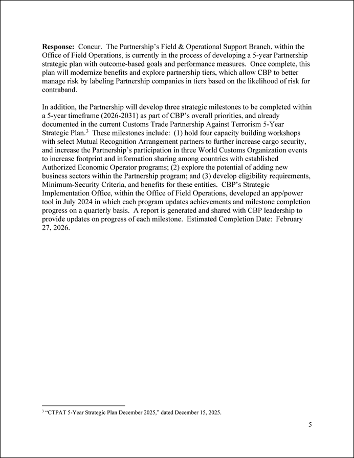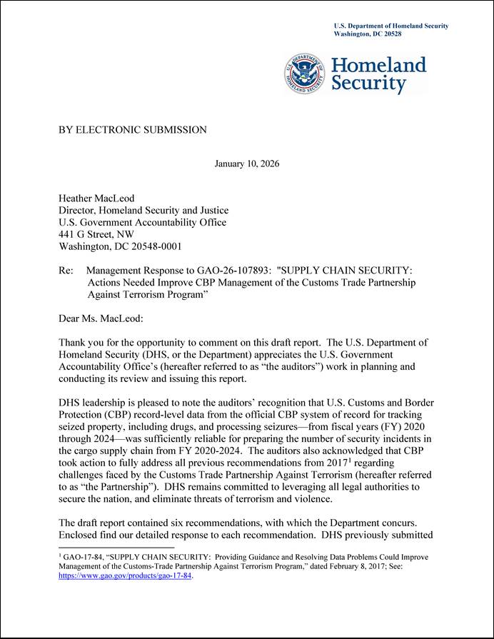 [1]The Security and Accountability for Every Port Act of 2006 (SAFE Port Act) codified the Customs Trade Partnership Against Terrorism (CTPAT) program. In addition to establishing this program as a voluntary government-private sector partnership to strengthen and improve the overall security of the global supply chain, among other things, the act requires U.S. Customs and Border Protection (CBP) to review the minimum security requirements of the CTPAT program at least once a year. See Pub. L. No. 109-347, tit. II, subtit. B, §§ 211-23, 120 Stat. 1884, 1909-15 (codified at 6 U.S.C. §§ 961-73).
