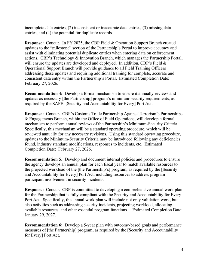 [39]The SAFE Port Act separately requires that CBP develop an annual plan for revalidation that includes performance measures, an assessment of the personnel needed to perform the revalidations, and the number of participants that will be revalidated during the following year. Pub. L. No. 109-347, § 219(3), 120 Stat. at 1913-1914 (codified at 6 U.S.C. § 969(3)). In response to this requirement, the CTPAT program issued a work plan for fiscal year 2025 that includes the program’s projected workload of validating participant security standards to each of its field offices. This annual work plan is specific to CTPAT’s work in support of participant validations and includes information on in-person or virtual visits to participant locations to validate their supply chain security practices and sets a specific number of validations for each CTPAT supply chain security specialist to complete within the fiscal year. See CBP, 2025 Fiscal Year CTPAT Work Plan Executive Summary.