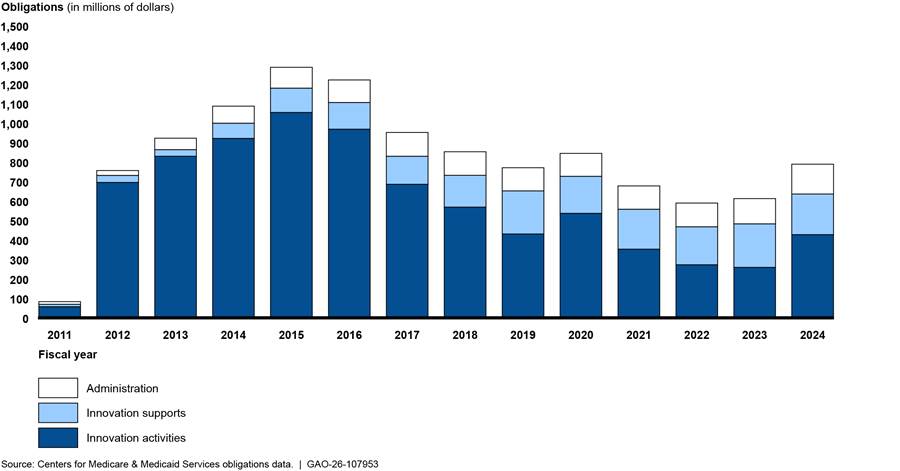Figure 2: Center for Medicare and Medicaid Innovation (Innovation Center) Obligations, by Year and Category, Fiscal Years 2011–2024