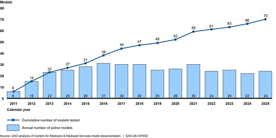 As of January 2025, the Innovation Center had tested 70 models, ranging from six in 2011 to 31 in 2016. (See fig. 3.) The Innovation Center had concluded the testing of 46 of these models and was actively testing 24 models—referred to in this report as “active models.” (See app. 1 for details on the Innovation Center’s 70 models.)