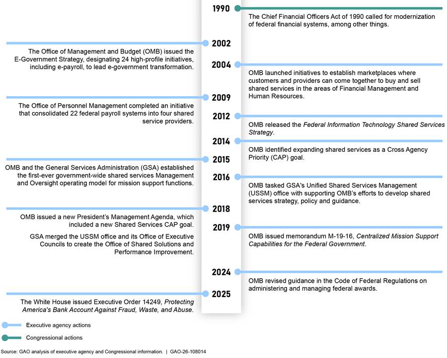 Over the last 20 years, the federal government has taken a variety of actions, including issuing directives and standards, to promote and implement shared services that have varied in scope and scale.[8] See figure 1 for a timeline of key Congressional and executive actions through March 2025.