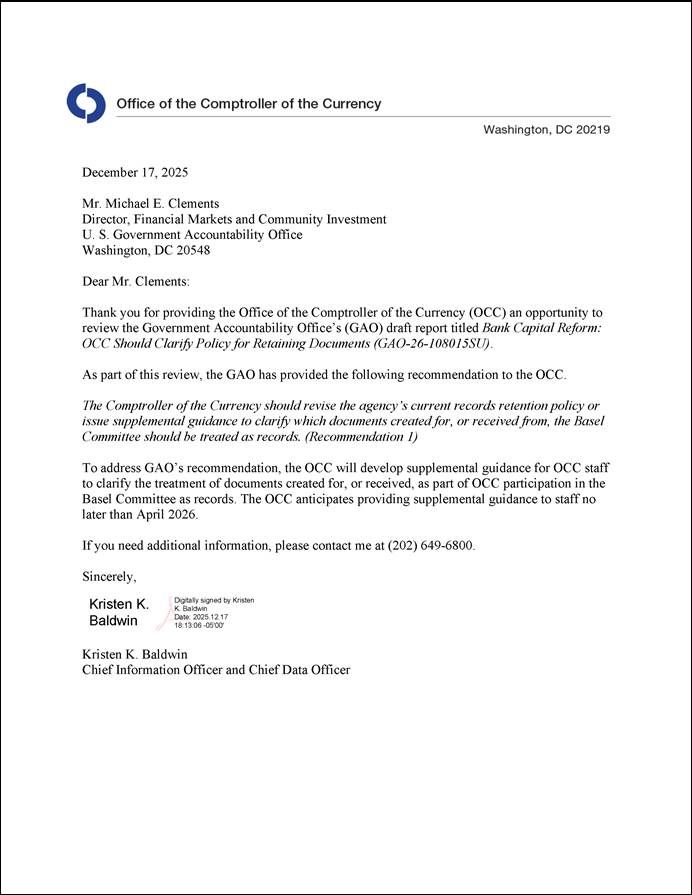 In its comments, OCC agreed with our recommendation. OCC stated that it would develop supplemental guidance for OCC staff to clarify the treatment of documents created for, or received, as part of OCC participation in the Committee as records. OCC anticipates providing the supplemental guidance to staff no later than April 2026.
