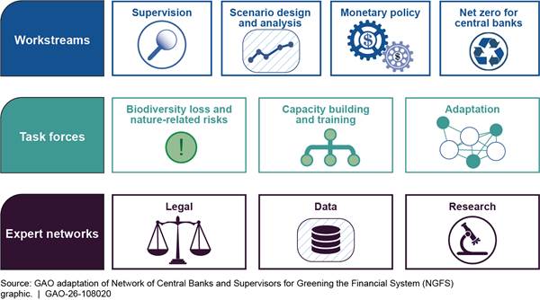 Source: GAO analysis of Board of Governors of the Federal Reserve System (Federal Reserve), Office of the Comptroller of the Currency (OCC), Federal Deposit Insurance Corporation (FDIC), and Network of Central Banks and Supervisors for Greening the Financial System (NGFS) information. | GAO-26-108020