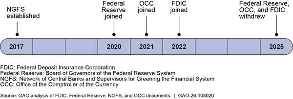 The Board of Governors of the Federal Reserve (Federal Reserve), Office of the Comptroller of the Currency (OCC), and Federal Deposit Insurance Corporation (FDIC) joined NGFS in 2020, 2021, and 2022, respectively, to better understand climate-related financial risks and collaborate internationally. They withdrew in 2025, generally citing (1) changed agency priorities, (2) a determination that continued participation was inconsistent with their statutory mandates to ensure safety and soundness of financial institutions, and (3) NGFS’s increasing focus on broader environmental risks.
