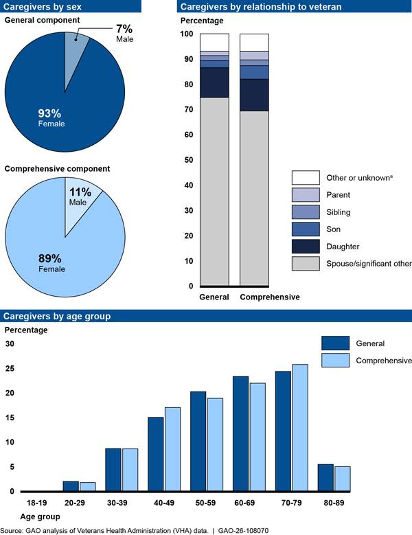 We also used data from VHA to describe characteristics of caregivers enrolled or participating in the Caregiver Support Program for fiscal years 2021 through 2025. Specifically, we obtained data on the number of caregivers enrolled or participating in the program by sex, age groups, and relationship to the veteran for the general and comprehensive components for each fiscal year.[35] We divided the number of caregivers in each demographic group by the number of caregivers enrolled or participating in the program to calculate percentages.