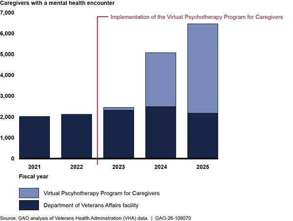The Veterans Health Administration’s (VHA) Caregiver Support Program offers mental health support, among other benefits, to eligible caregivers who provide around the clock care for veterans with serious injuries. This includes support groups and respite care. In fiscal year 2025, VHA data show the program served about 98,000 caregivers. In addition, VHA obligated $2.6 billion to implement the program, according to officials. VHA officials told GAO the program has grown significantly since fiscal year 2021 due in part to expanded eligibility criteria that allowed more caregivers to participate as of October 1, 2020.