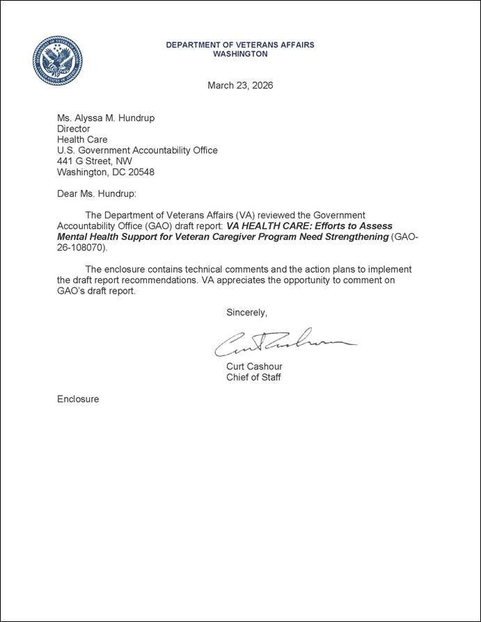 With respect to our second recommendation, VA stated that it will establish quantitative targets and time frames to monitor mental health services provided through VA medical centers and the Virtual Psychotherapy Program for Caregivers. VA stated that it will develop tools and collect data to measure progress towards such targets and a plan to assess performance periodically. VA estimates it will complete these actions by February 2027.
