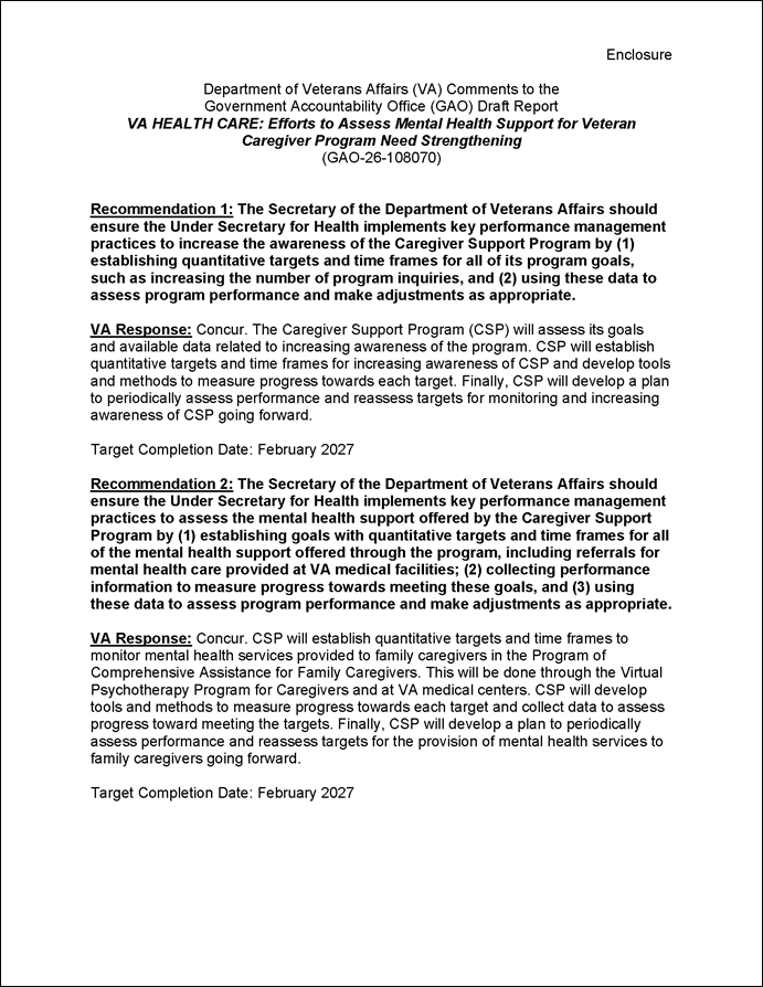 Regarding our first recommendation, VA stated that the Caregiver Support Program will establish quantitative targets and time frames for increasing awareness of the program. In addition, VA stated that it will develop tools to measure progress towards such targets and a plan to assess performance periodically. VA estimates it will complete these actions by February 2027.