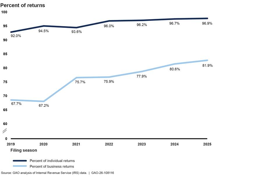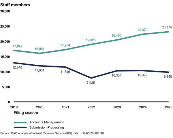 You asked us to assess IRS’s performance during the 2025 filing season. Additionally, the Inflation Reduction Act of 2022 (IRA) includes a provision for us to support oversight of the use of funds appropriated in the IRA.[4] In this report, we assess (1) IRS’s staffing levels and performance processing individual and business tax returns and providing customer service during the 2025 filing season; (2) the extent to which IRS’s staffing levels and performance changed after the filing season; and (3) IRS’s workforce planning and modernization efforts, including those using IRA funds, for future filing season operations.