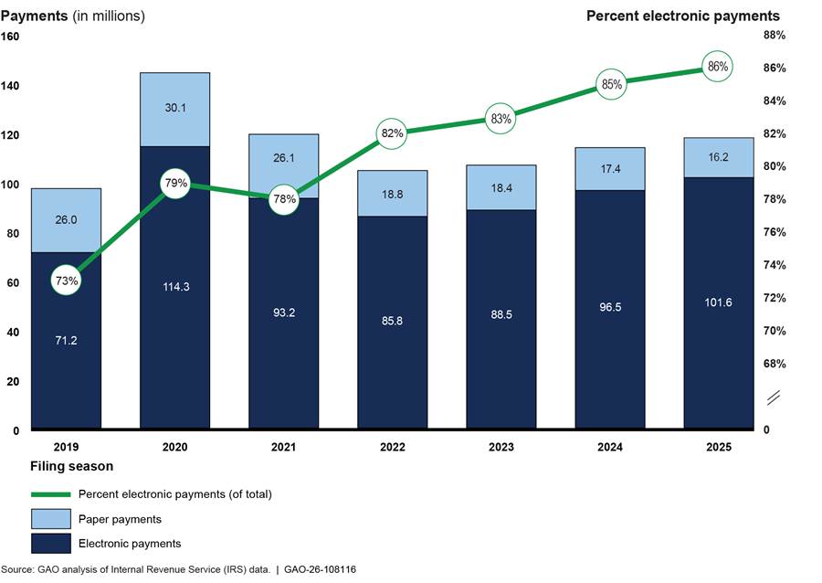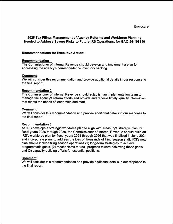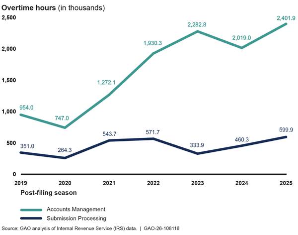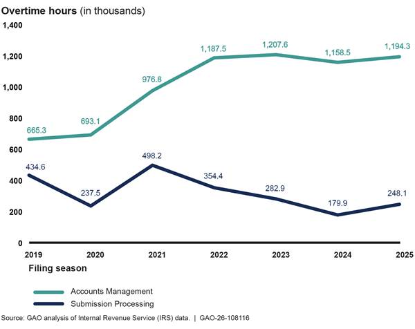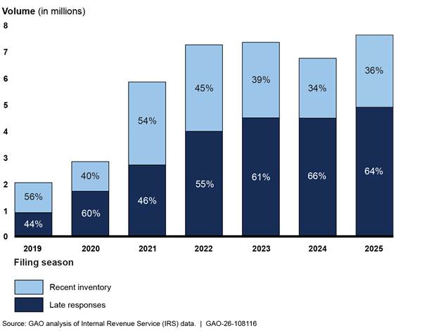 IRS carried out the 2025 filing season and its plans for 2026 during a time of swift, immense change for the federal workforce. For example, like other agencies, IRS adjusted operations to comply with directives to cease hiring efforts, return employees to in-person work, and reduce the federal government’s real estate footprint, among other things. IRS has also experienced long-standing operational challenges on which we have previously reported. For example, IRS faced challenges processing paper returns on time, reducing its backlog of millions of pieces of taxpayer correspondence, and managing ongoing human capital issues like staff attrition and use of overtime.[1]