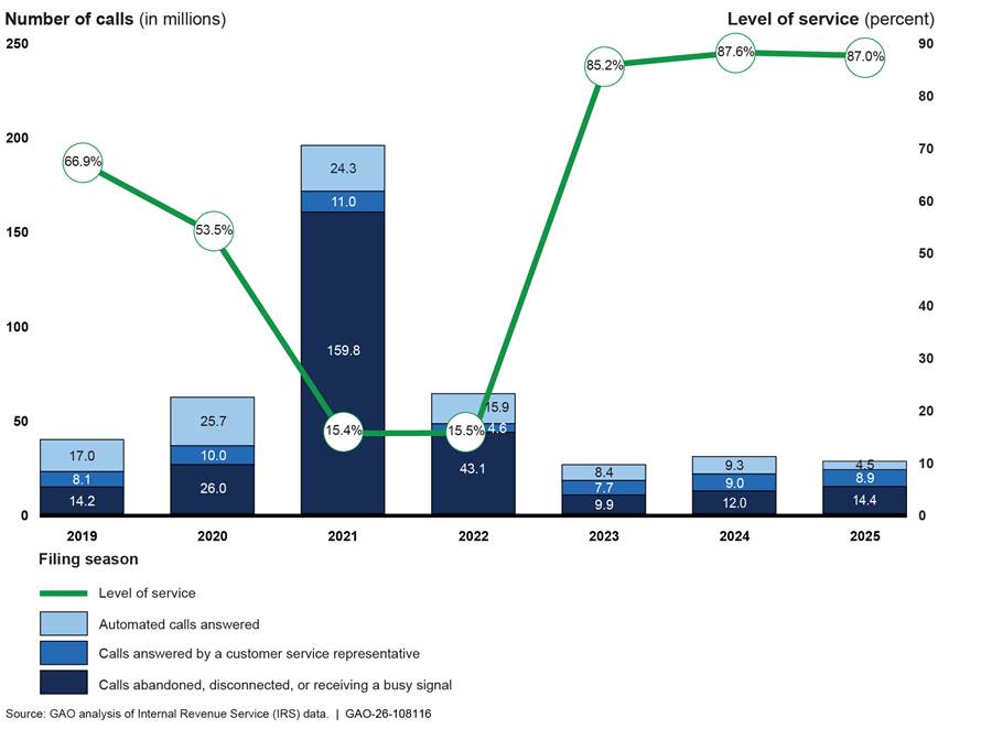 [28]In January 2026, IRS announced that it will replace the level of service metric with enterprise metrics that reflect new technologies and service channels to more accurately measure how IRS serves taxpayers.