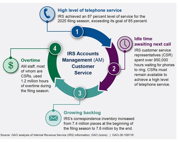 [22]See GAO‑25‑107375 and GAO, 2023 Tax Filing: IRS Improved Customer Service, but Could Further Improve Processing and Evaluate Expedited Hiring, GAO‑24‑106581 (Washington, D.C.: Jan. 25, 2024).