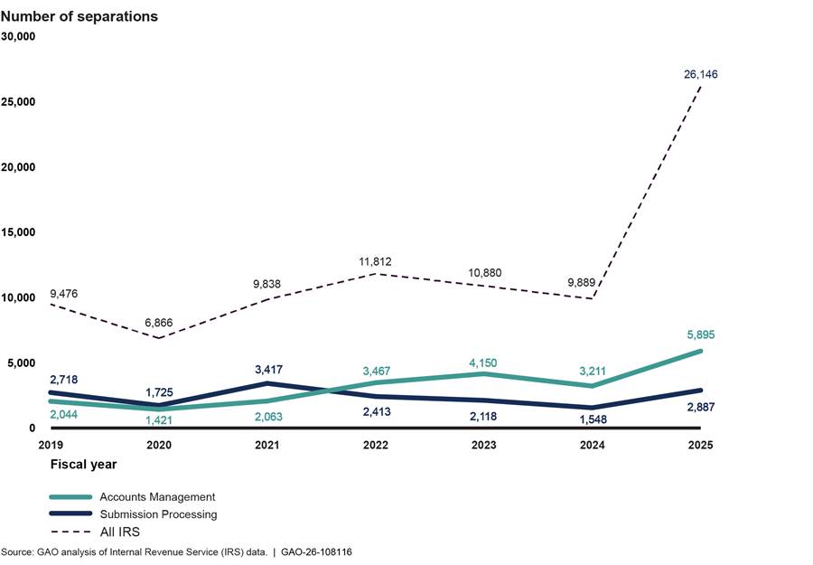 Note: For more details on IRS’s 2025 separations data, see figure 9 in GAO-26-108116.