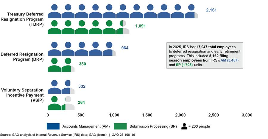 [43]TIGTA reported that as of May 2025, 22,422 IRS employees had accepted deferred resignation and early retirement program offers. See TIGTA, Snapshot Report: IRS Workforce Reductions as of May 2025, 2025-IE-R027 (Washington, D.C.: July 18, 2025). However, IRS officials told us that the total number of separations through these programs as of December 2025 is lower than the number of accepted agreements that were previously reported because some employees accepted IRS’s offer to rescind agreements before the end of the fiscal year (September 30) and IRS was still processing retirements for voluntary separation participants.