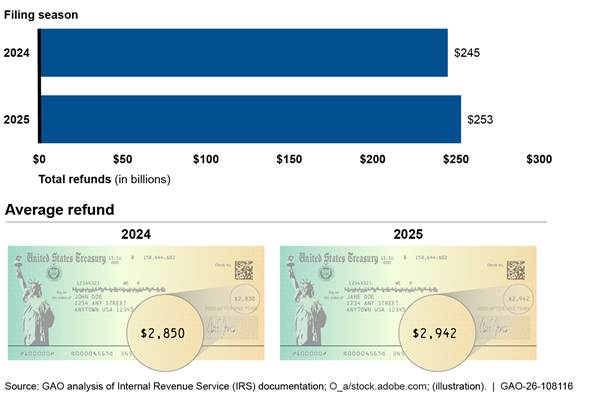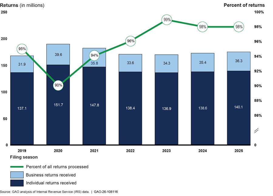During the annual tax filing season, IRS processes millions of tax returns and issues hundreds of billions of dollars in taxpayer refunds. IRS also provides customer service to tens of millions of taxpayers. IRS carried out the 2025 filing season and its plans for 2026 during a time of swift, immense change for the federal workforce. IRS’s workforce changes and recent tax law changes could exacerbate the agency’s long-standing challenges to process tax returns on time and meet customer service demands.
