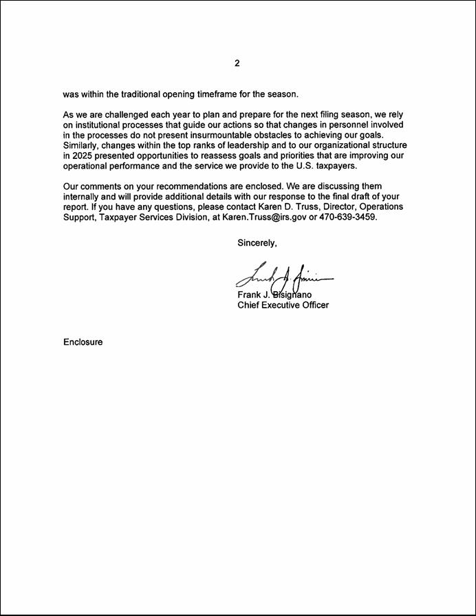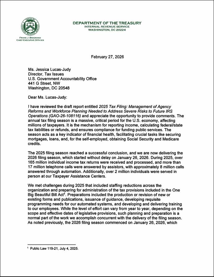 [44]Treasury Inspector General for Tax Administration, Deputy Inspector General for Audit, The Internal Revenue Service’s Readiness for the 2026 Filing Season (Audit No.: 2026400002), memorandum for Commissioner of Internal Revenue (Jan. 26, 2026).
