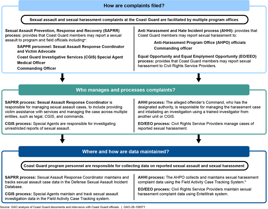 [8]See, e.g., Coast Guard, Commandant Instruction 1754.10F, Sexual Assault Prevention, Response and Recovery (SAPRR) Program, (Washington, D.C.: April 13, 2023); Commandant Instruction 5350.6A., Harassing Behavior Prevention, Response and Accountability, (Washington, D.C.: Nov 13, 2025); Commandant Instruction 5520.5G U.S. Coast Guard, Coast Guard Investigative Service Roles and Responsibilities, (Washington, D.C.: Jan. 11 2023); and Commandant Instruction M5350.4E, U.S. Coast Guard Civil Rights Manual, (Washington D.C.: Oct. 21, 2020).