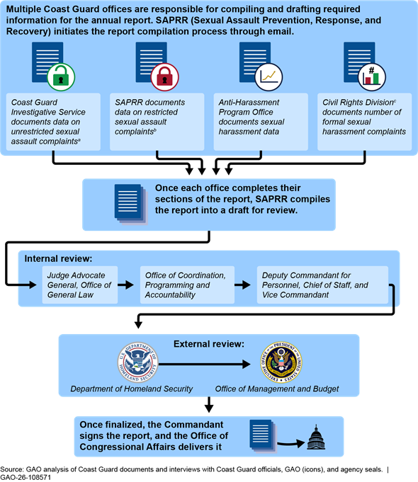The Coast Guard has a process for compiling its annual report on sexual assault and sexual harassment to Congress. According to Coast Guard officials and documented procedures, several program offices are responsible for compiling and drafting required information for the report, as outlined in figure 2 below. The External Coordination Division begins this process by sending an email, which includes the statutory requirements and the previous report to Congress on sexual assault and harassment. Officials told us that SAPRR is also responsible for managing the drafting and review of the annual report. Coast Guard officials stated that the process for compiling the report is straightforward because they primarily seek to update the information from the previous report. The Department of Homeland Security and Office of Management and Budget are to review the report prior to release.[25]