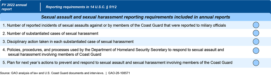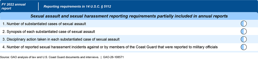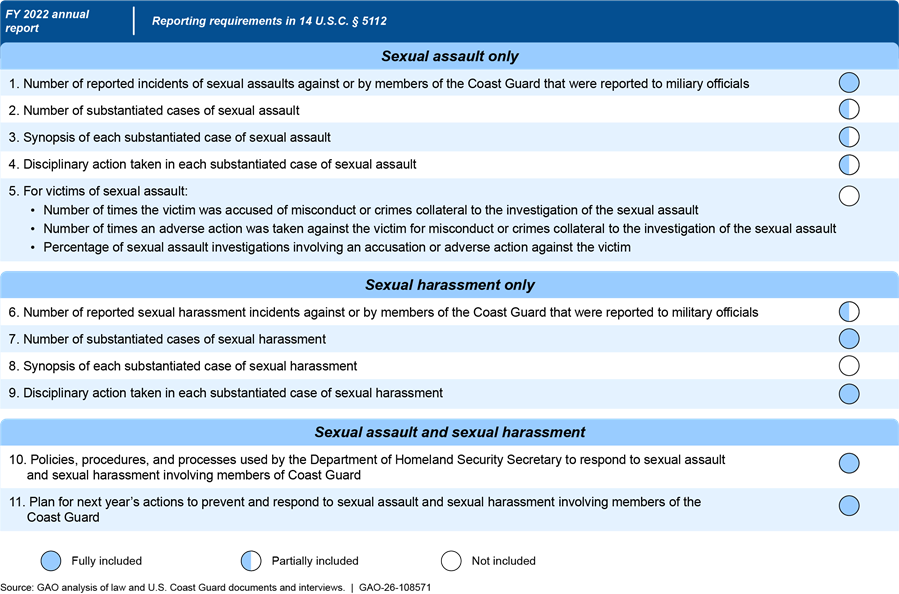 Note: The fiscal year 2022 report was the most recent report available at the time of our review. The Coast Guard interprets 14 U.S.C. § 5112(a) and (b)(1) to only require instances involving the Coast Guard’s military workforce. Accordingly, alleged instances of sexual assault that involve only civilian members of the Coast Guard are not included in the report. According to the Coast Guard, the report does include data on sexual harassment for civilian-on-civilian cases, but such information is not required to be included per 14 U.S.C. § 5112.