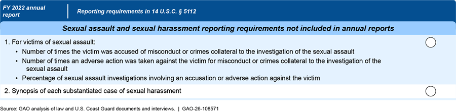 The Coast Guard is required to report various information related to sexual assault victims: (1) the number of times that assault victims were accused of misconduct or crimes collateral to the assault investigation, (2) the number of times that adverse action was taken against the victim for misconduct or crimes collateral to the investigation, and (3) the percentage of sexual assault investigations involving an accusation or adverse action against the victim.[41] This requirement was enacted in January 2021, but the Coast Guard did not include any information responsive to it in the 2022 report. Coast Guard officials said they could not account for this absence. Going forward, officials said that the recently established Office of the Chief Prosecutor will begin to provide this information, and they anticipated that it would be in the report covering fiscal year 2023.