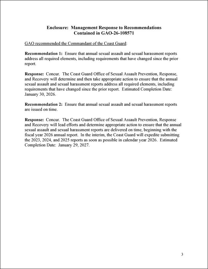 DHS concurred with the recommendation to ensure that annual sexual assault and sexual harassment reports are issued on time (Recommendation 2). DHS stated that Coast Guard will lead efforts and determine appropriate action to ensure that the annual sexual assault and sexual harassment reports are delivered on time, beginning with the fiscal year 2026 annual report. In the interim, the Coast Guard will expedite submitting the 2023, 2024, and 2025 reports as soon as possible in calendar year 2026.