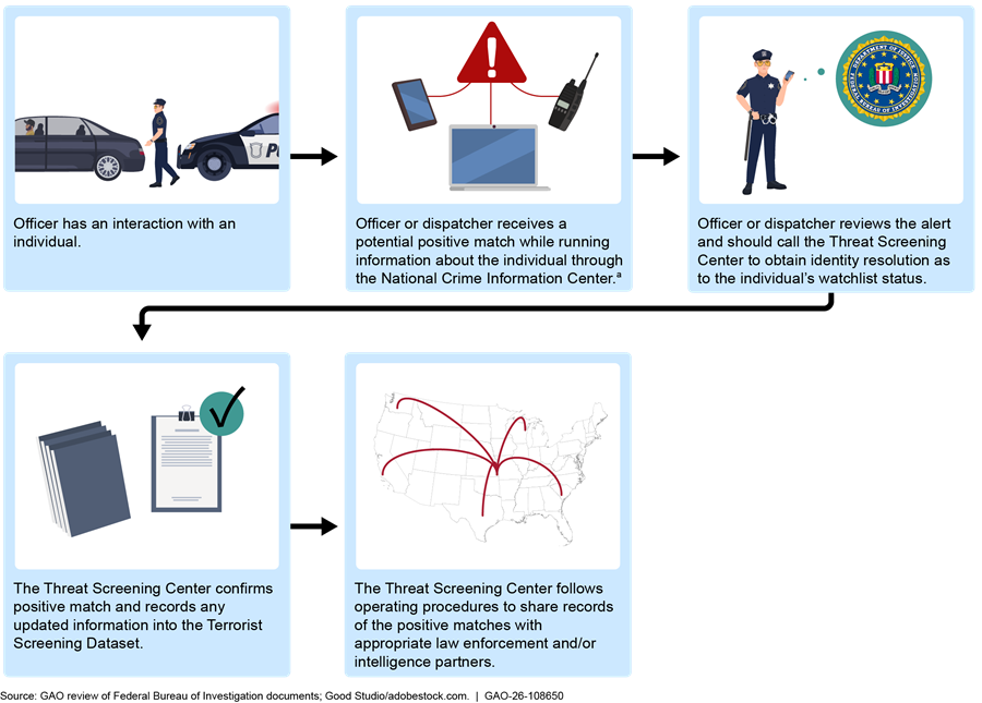 Nonfederal law enforcement officers query encountered individuals against the terrorist watchlist during routine police interactions, such as traffic stops. After encountering a potentially terrorist watchlisted individual, nonfederal law enforcement officers receive instructions, via the National Crime Information Center (NCIC), to contact the Federal Bureau of Investigation’s (FBI) Threat Screening Center to determine whether the individual is a positive or negative match to the terrorist watchlist.