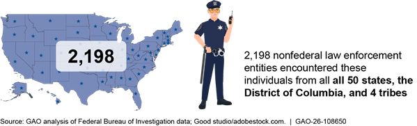 GAO reviewed watchlist policies and training resources for nonfederal entities and collected encounter data for fiscal years 2019 through 2024. GAO interviewed nonfederal law enforcement officials in four states selected based on the number of encounters and other factors. While not generalizable, these interviews provided insights into officials’ awareness of policies and training.