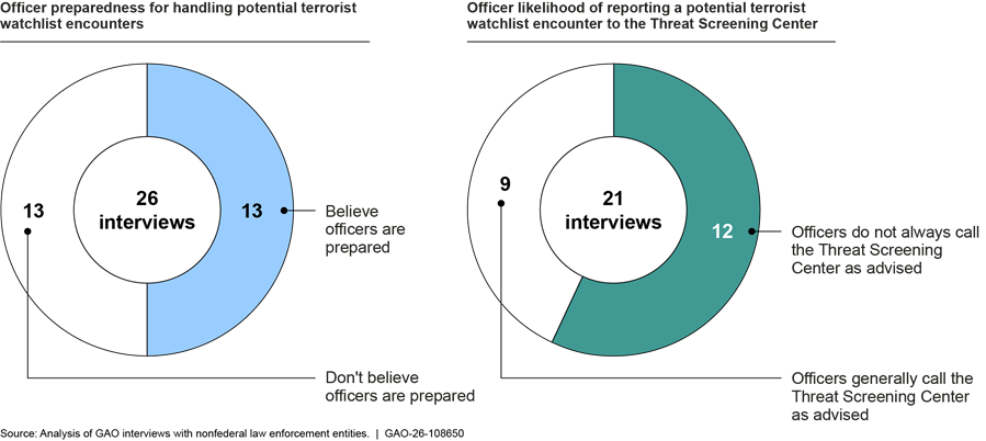 In our interviews with nonfederal law enforcement entities in four states, officials in half (13 of 26) of our interviews indicated that they do not believe that all of their officers are prepared to handle a terrorist watchlist encounter.[17] Further, officials in 12 of 26 of our interviews told us that their officers do not always call the Threat Screening Center as advised. Specifically, they believed that law enforcement officers in their areas of responsibility were not consistently reporting encounters with potential terrorist-watchlisted individuals to the Threat Screening Center in instances where it was warranted. Officials in nine of 26 of our interviews told us that they believed that their law enforcement officers were reporting encounters with watchlisted individuals to the Threat Screening Center, as shown in figure 3.[18]