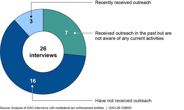 To address both objectives, we spoke with officials representing 55 different nonfederal law enforcement entities during 26 in-person or virtual interviews. These entities included fusion centers, state police departments, and local police departments and sheriff’s offices. The entities were based in four states selected for site visits: California, Michigan, Texas, and Virginia.