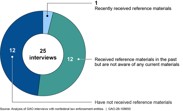 [23]Officials in one interview said that they received current reference materials from the Threat Screening Center. Reference materials were not discussed in the one remaining interview. Further, officials in three of the five interviews with national and state dispatcher associations said that they did not know of any reference materials distributed by the Threat Screening Center or did not recently receive such materials. This was not discussed in the two remaining interviews with dispatcher associations.