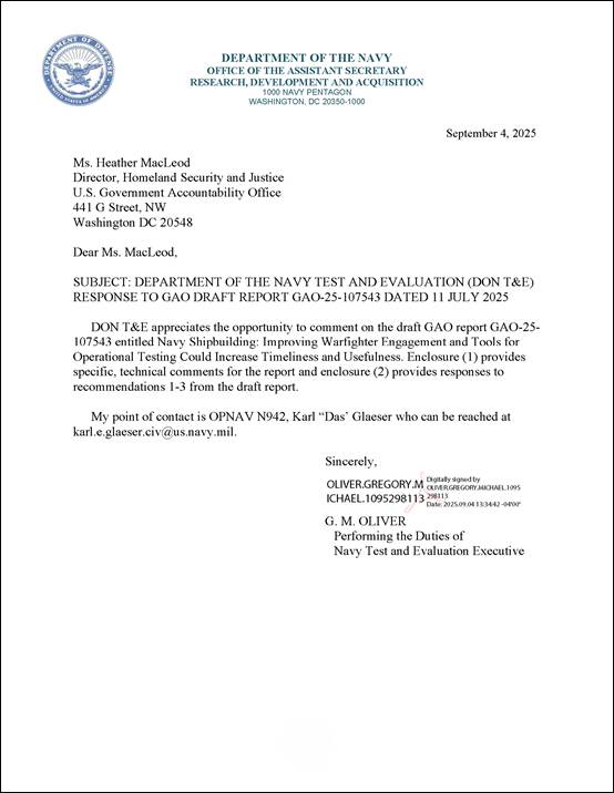 [27]Secretary of the Navy Instruction 5000.2G; Department of the Navy Acquisition Test and Evaluation Manual; OPTEVFOR, Operational Test and Evaluation Manual; and Department of the Navy, Naval Sea Systems Command (NAVSEA), Test and Evaluation Policy, NAVSEA Instruction 3960.2E (Feb. 3, 2025).